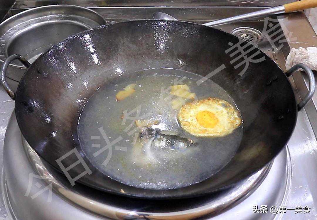 鱼头煎至两面金黄时倒入适量的开水,千万不要加凉水,容易使蛋白质凝固,不能充分炖出里面的胶原蛋白,放入煎好的鸡蛋,盖上锅盖开大火炖煮10分钟,一定要开大火,这是鱼汤浓郁奶白的关键。