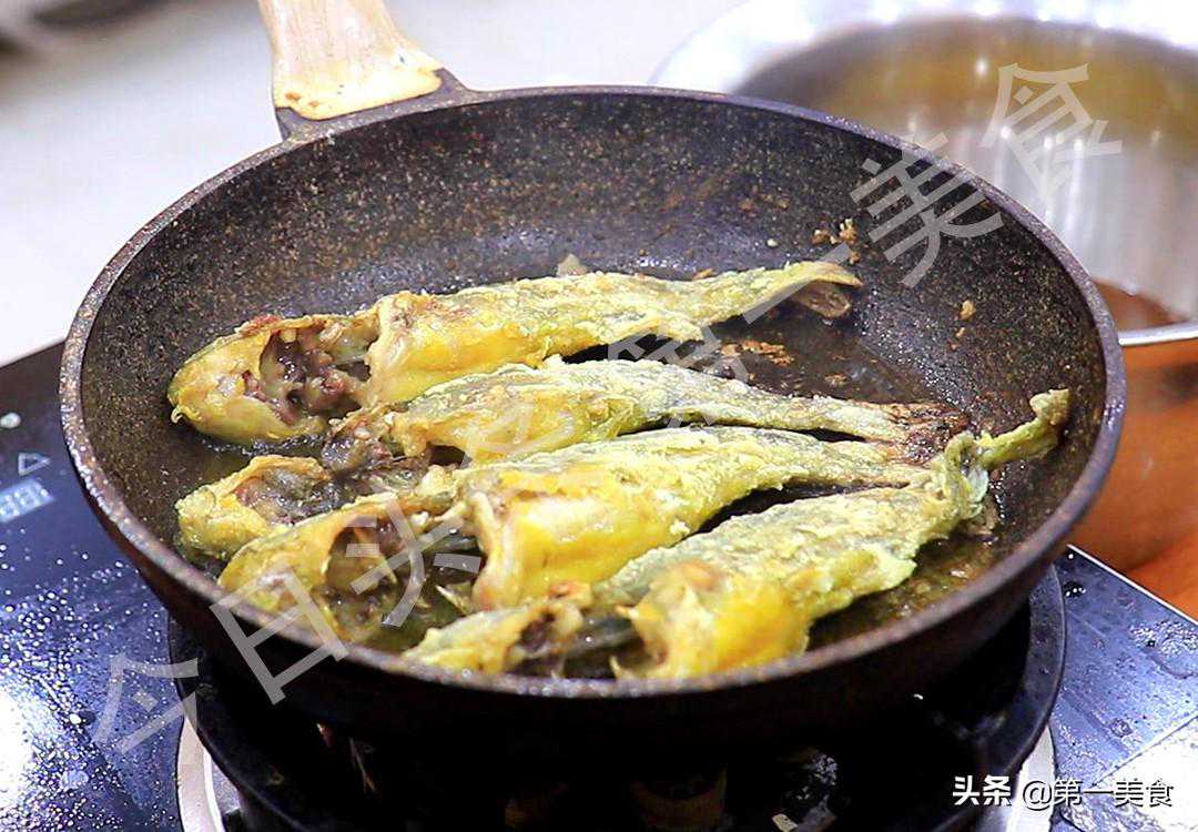 平底锅烧热,倒入植物油滑锅,滑好锅以后倒出热油多加一些凉油,油温四成热时把黄骨鱼依次放入锅中,开小火慢慢煎,大约煎制5分钟,黄骨鱼煎香煎酥以后取出来备用。