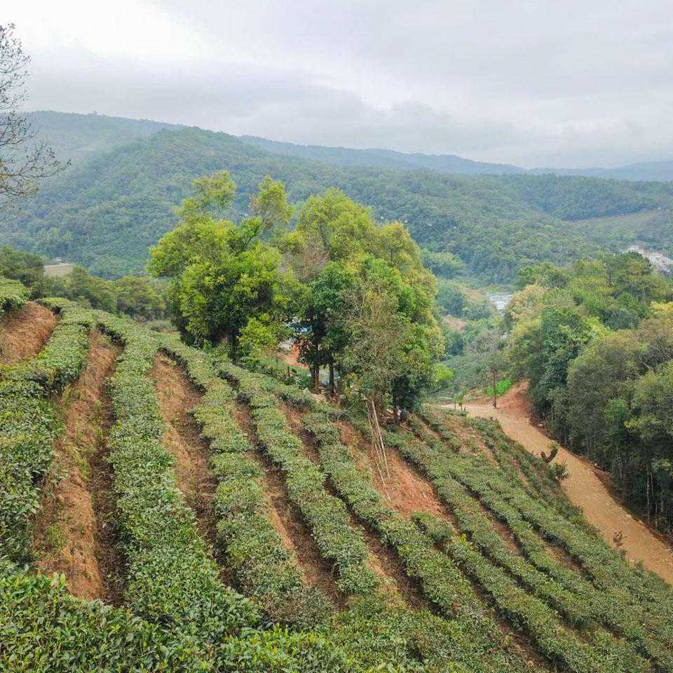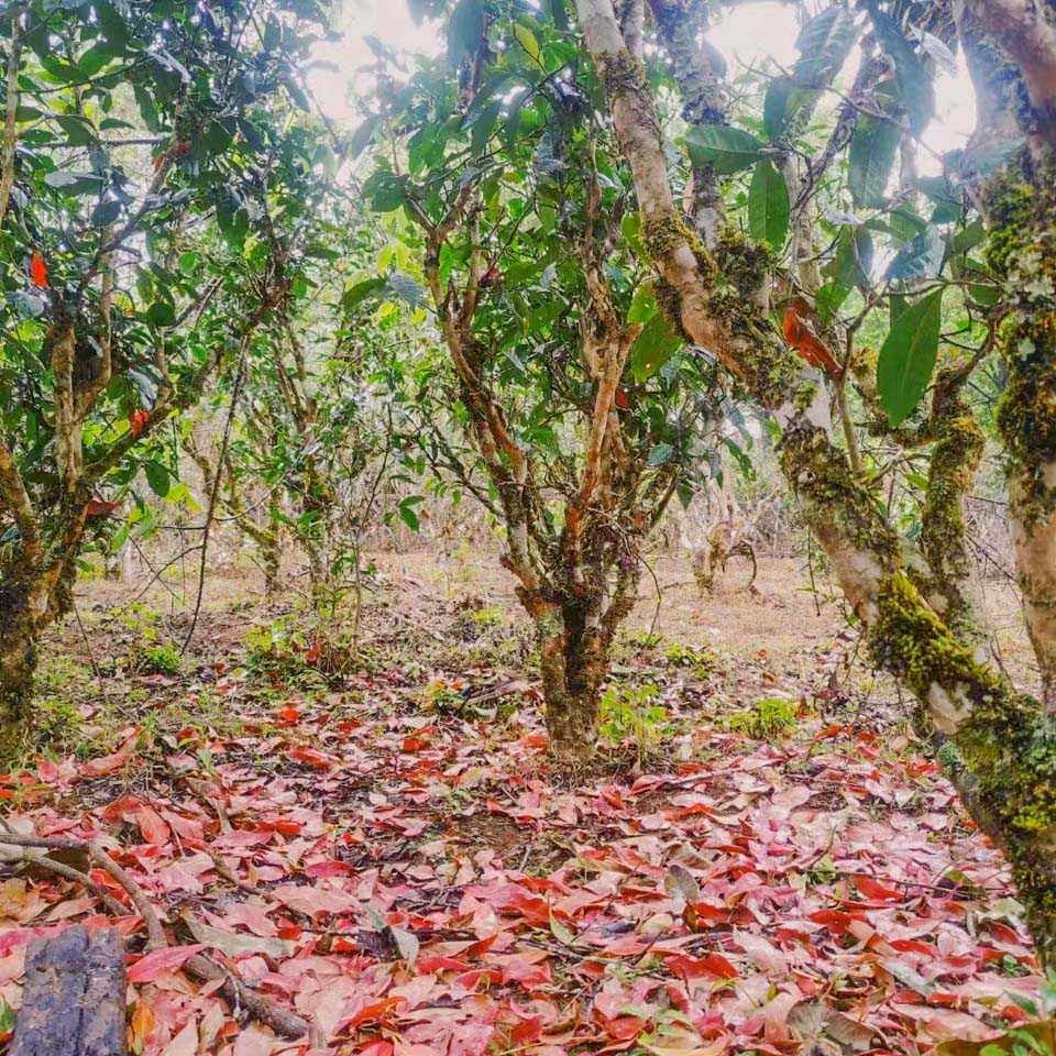 茶林里最醒目的是那些高大粗壮的乔木,有榕树、红椿、茱萸、木荷、多依等,几乎都是几人合围的树干,枝叶舒展着指向云天,显露出岁月沧桑的气息,有的树枝下还吊着巨大的蜂包,也不知道那些蜂虫已经在这里生存了多少年多少代。乔木之下是一株株高矮粗细不一的茶树,树龄从数年到千年不等,茶林下方生长的是各种禾本科和蕨类植物,还有草药和野菜,细心翻找的话总会有所收获。