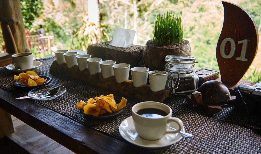 我们绕过晾晒架,从吊脚楼一侧的楼梯走到二楼。楼梯口左侧有一桌一椅,廖秀桂坐在桌后,一丝不苟地为每个访客登记,同时兼负收银员的工作。在这里,游客只要花上60块钱就能品尝到9种咖啡,每一种从种植、处理、烘焙到冲泡均出自这座咖啡庄园,可谓个性到极致。吊脚楼的另一侧有一张巨大的吧台,上面琳琅满目地放着各式各样的咖啡杯、冲泡咖啡的器具、咖啡豆样品以及一些装饰。吧台前零星坐了几位客人,正悠闲地喝着咖啡,一位中年女子在吧台后忙碌,她是廖秀桂的女儿。廖秀桂夫妇、女儿与女婿还有孙子,一家三代人都投入到咖啡事业中,各有一块擅长的领域,这也是小凹子咖啡庄园让人津津乐道的地方之一。