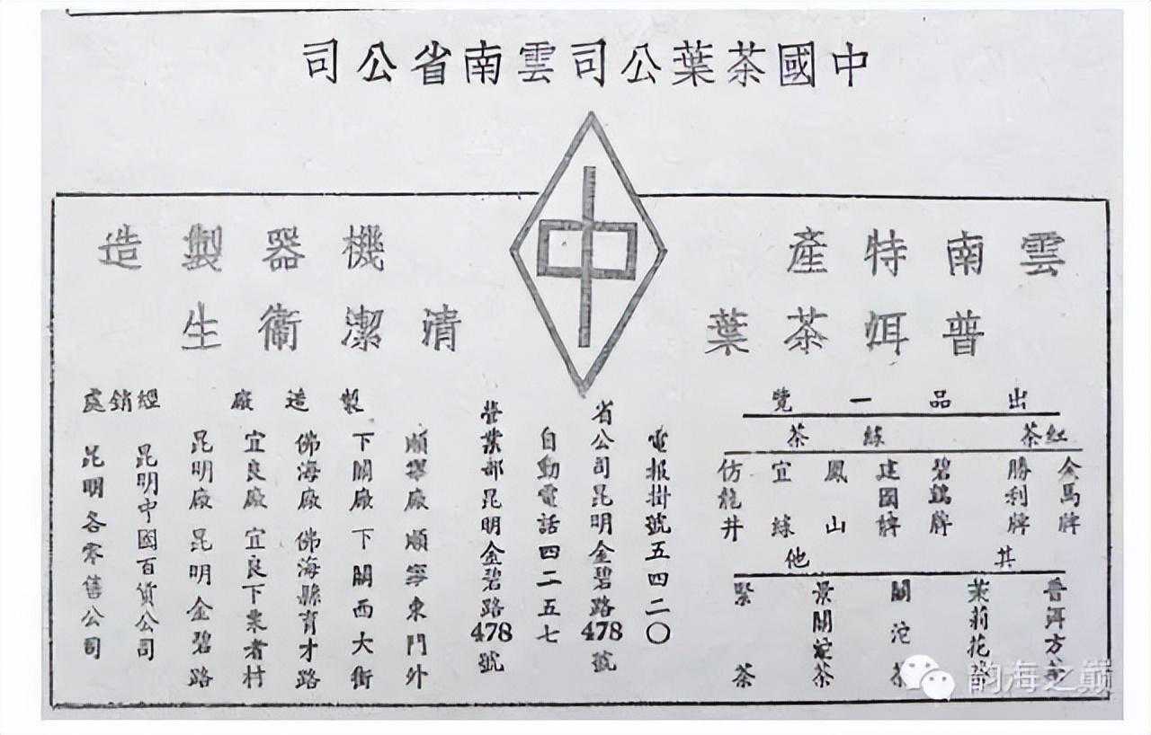 1941年起,云南中茶公司开始设计自己的标准商标。标准商标为盾牌型,由生生美术公司设计,上面的圆圈为蒋经国新生活运动的标志,下部分字体为“TheYunnanTeaCorporation“(即公司英文名)的缩写。