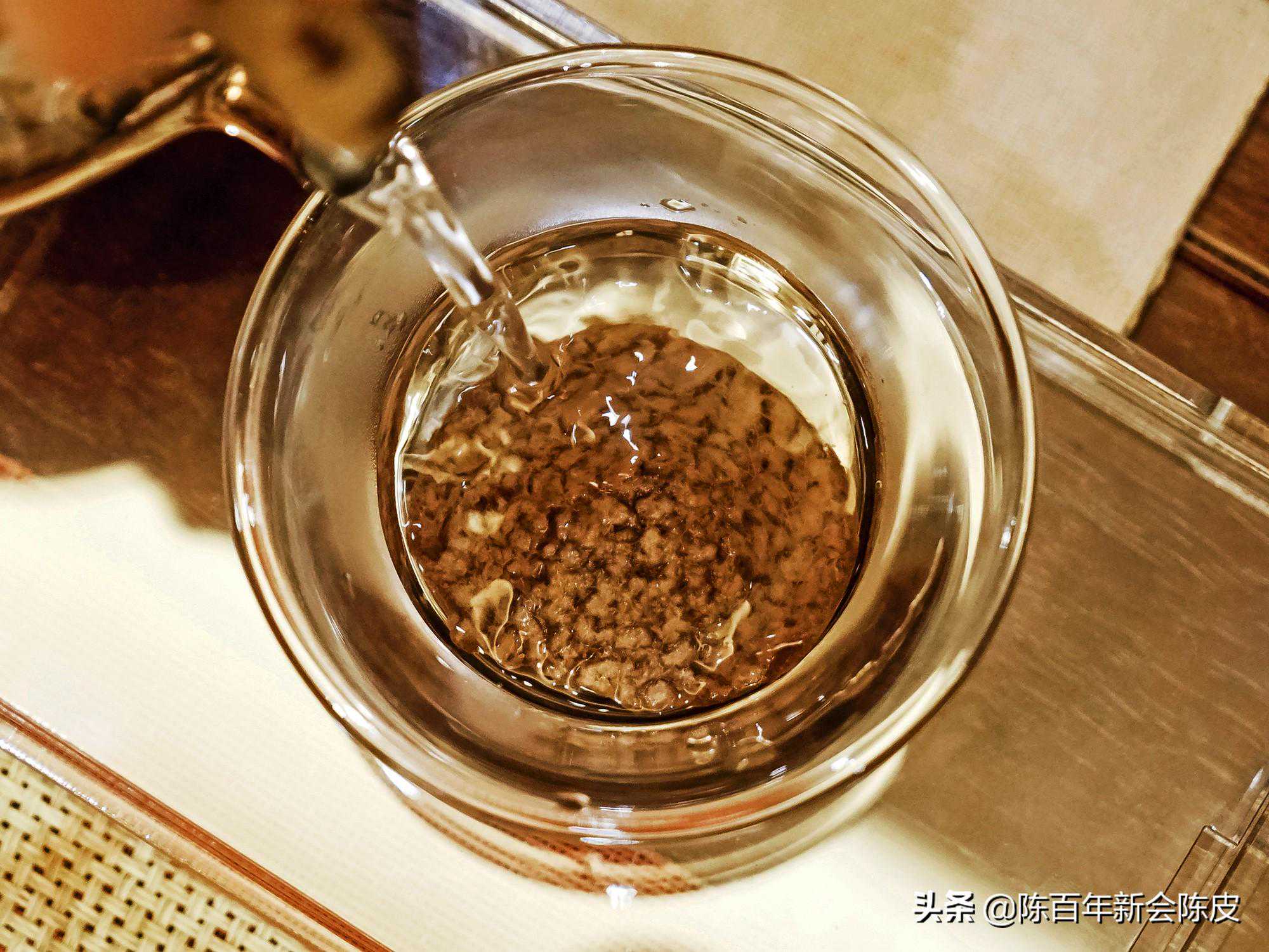 取四分之一的柑皮和普洱茶一起冲泡,先用沸水冲洗倒掉滤净,再用沸水冲泡约10秒。