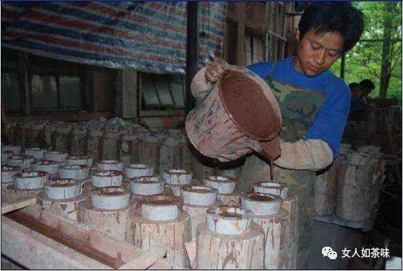制作工艺:将陶土打成泥浆,兑入具有凝固功能的化学原料——玻璃水,搅拌均匀后,批量倒入众多浇筑好的模型中,待凝固后,将模型分开,一把灌浆壶生坯即完工,