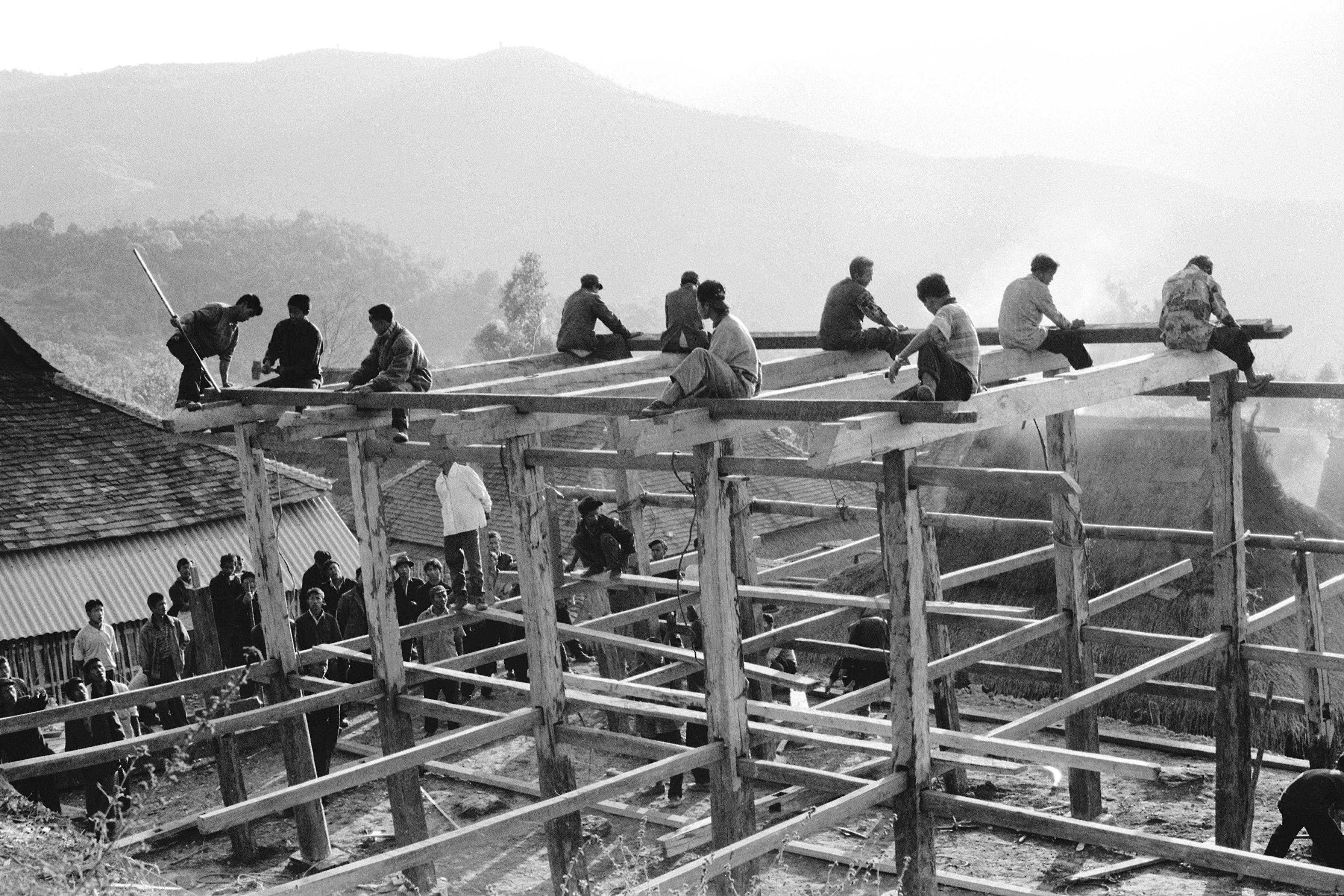 2000年12月,将榫卯结构的屋架立起来,装上椽子、檩子、楼梁,铺上楼板、篾笆、竹楼框架四周再围上一圈木板或竹片,屋顶盖上草排,三五天就盖起座竹楼。