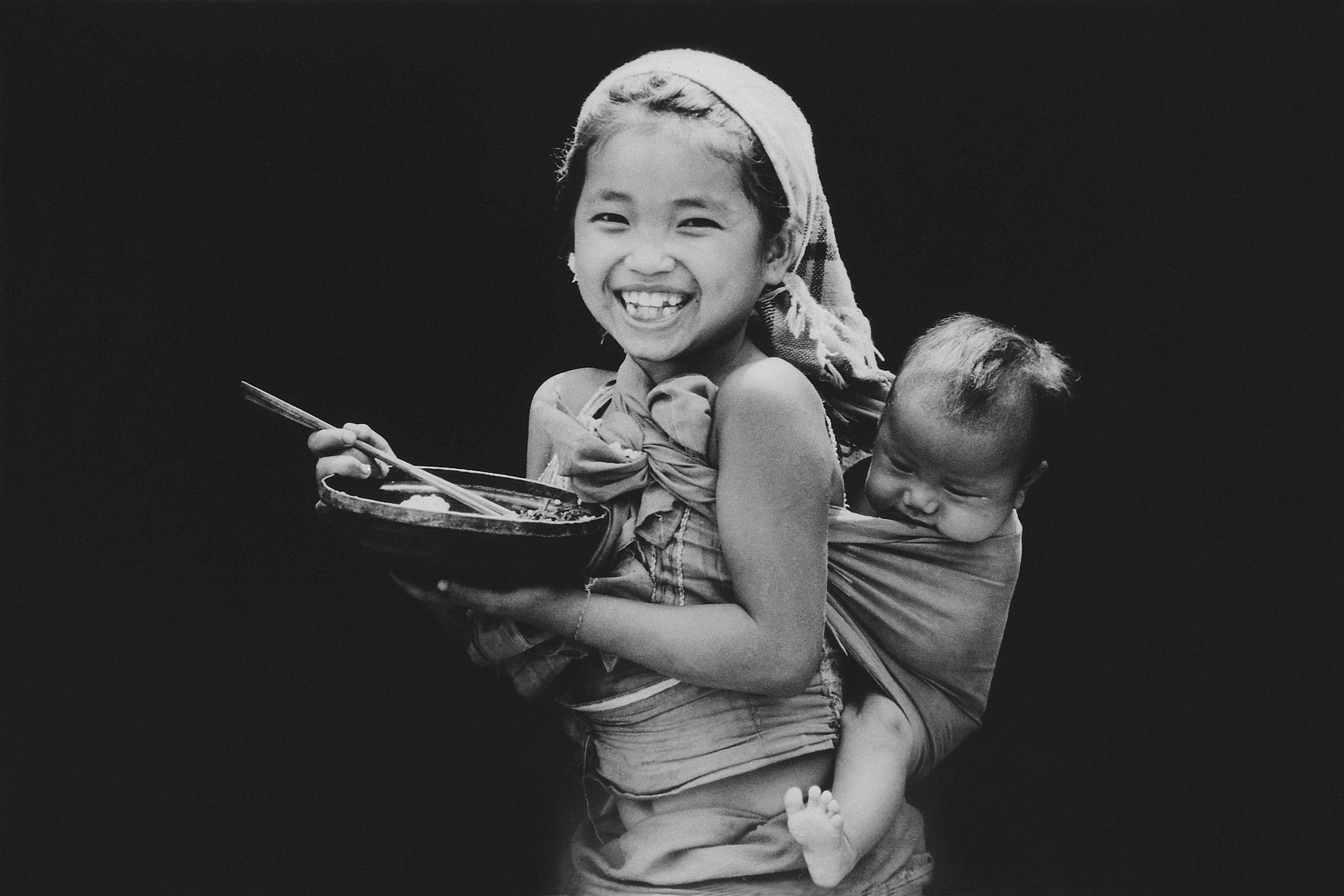 1998年4月,女孩用火塘上的锣锅盖当饭碗,方便、卫生、省事。罗怀学摄影