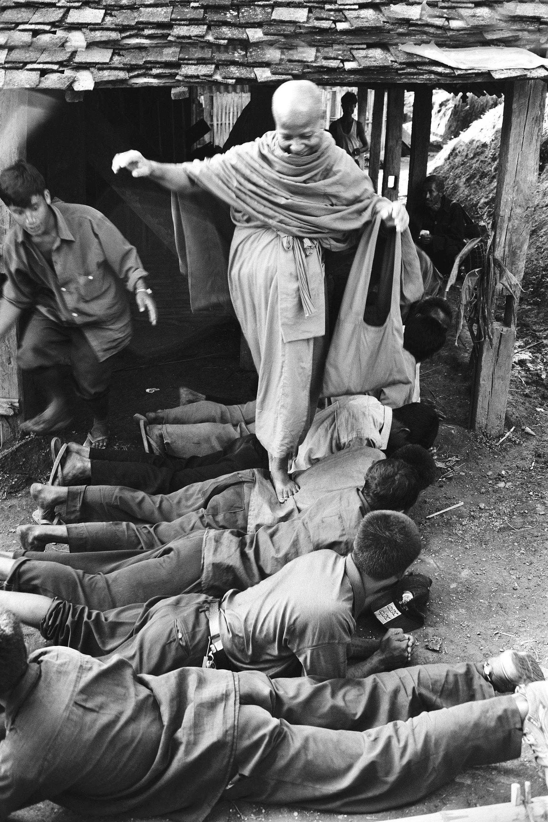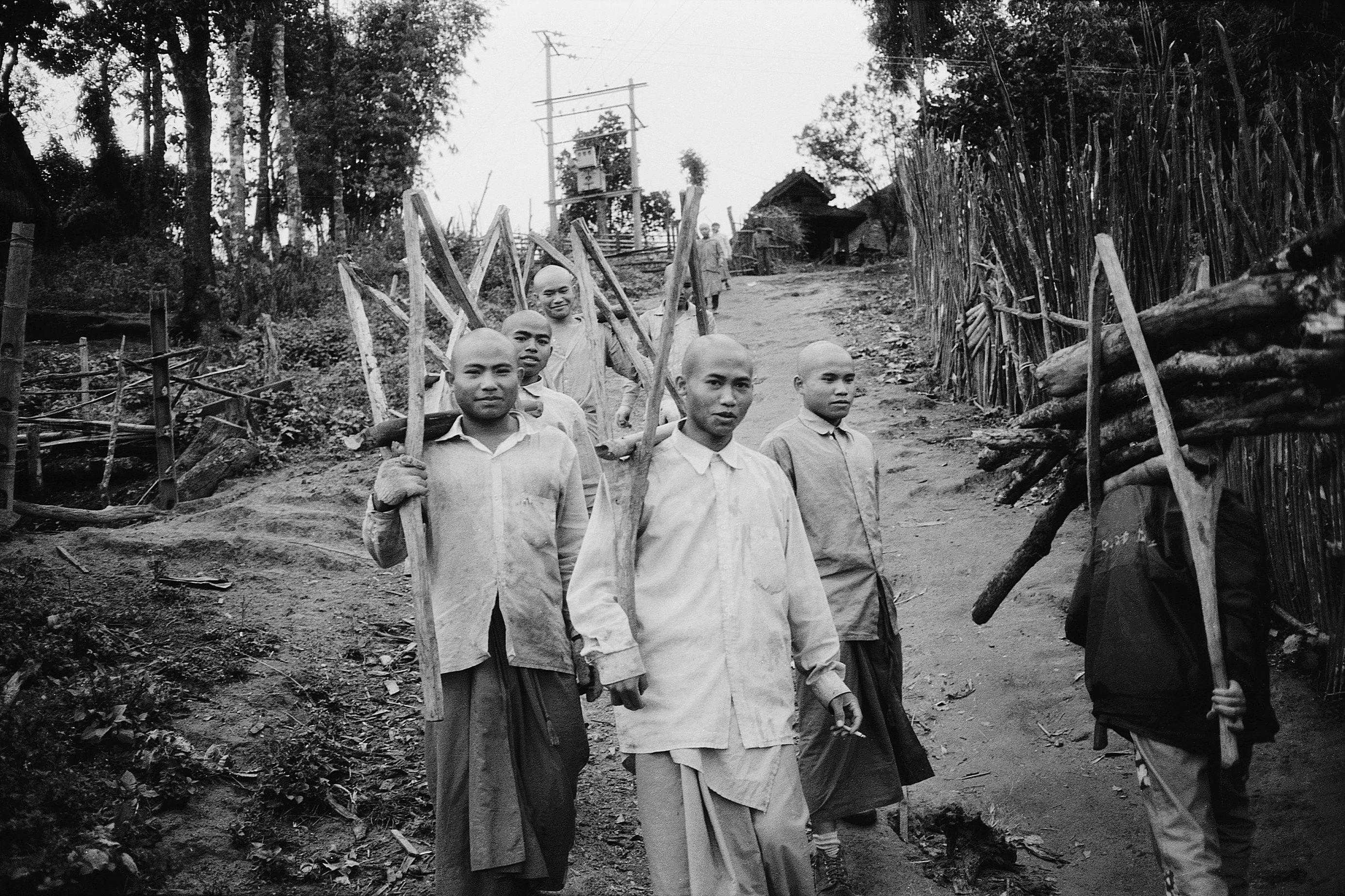 2001年10月,扛柴禾的僧侣。缅寺僧侣的吃穿用度都由信众供养。