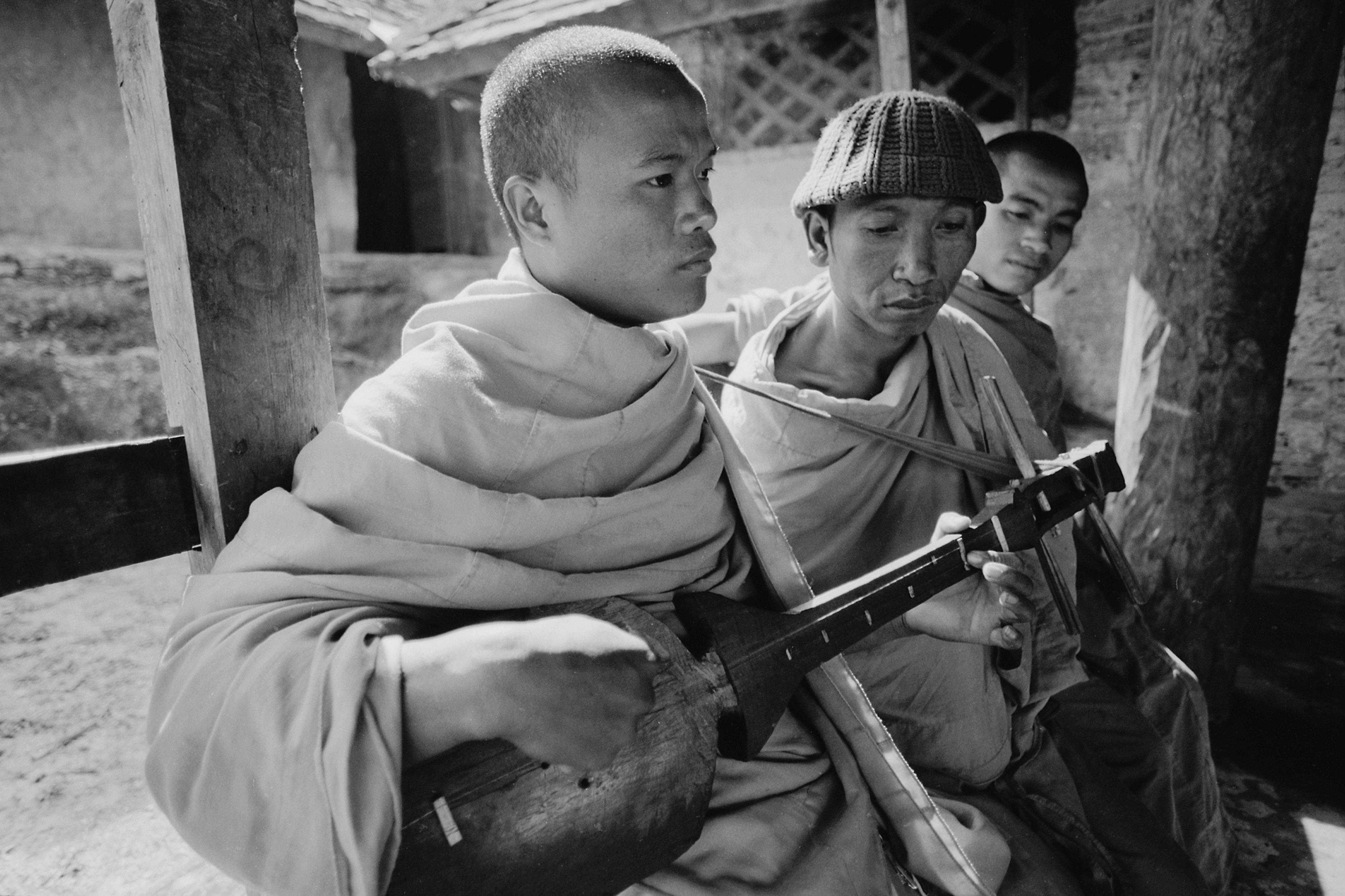 2002年5月,弹奏布朗调的缅寺佛爷。琴弦用自行车刹车线代替。