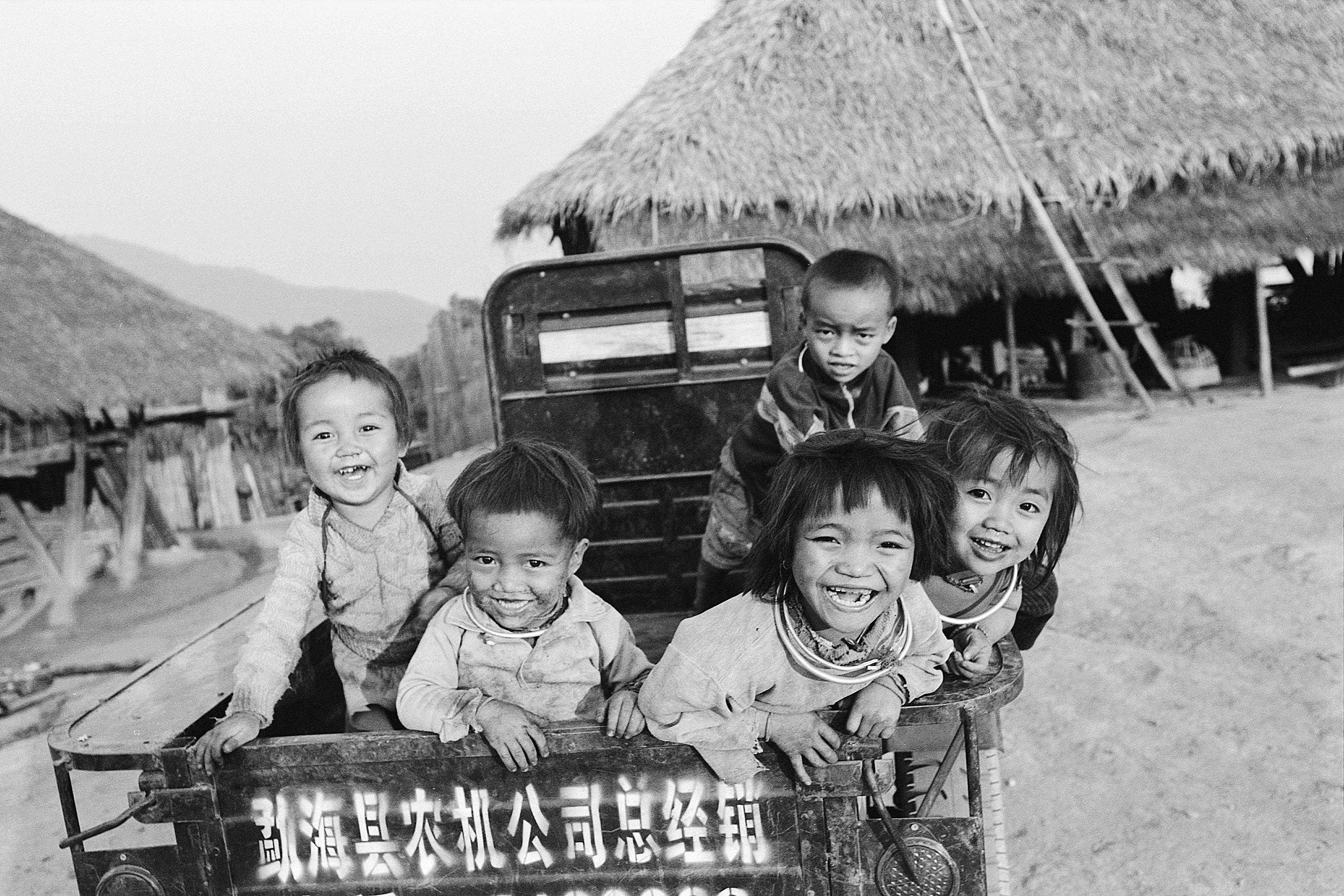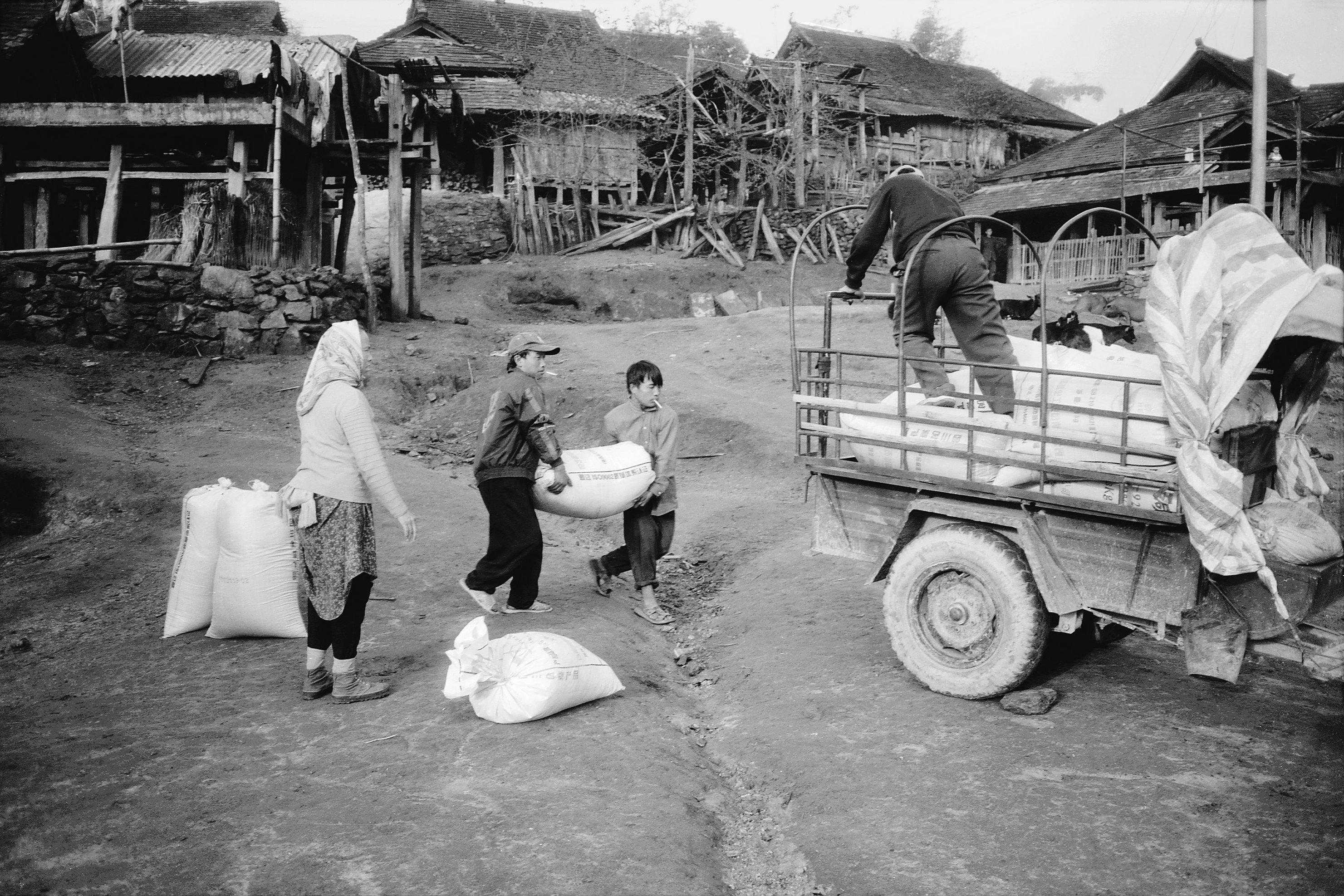 2005年12月,村民用新买的旧拖拉机载着一车孩子上路练车,第一次坐拖拉机孩子特别开心。