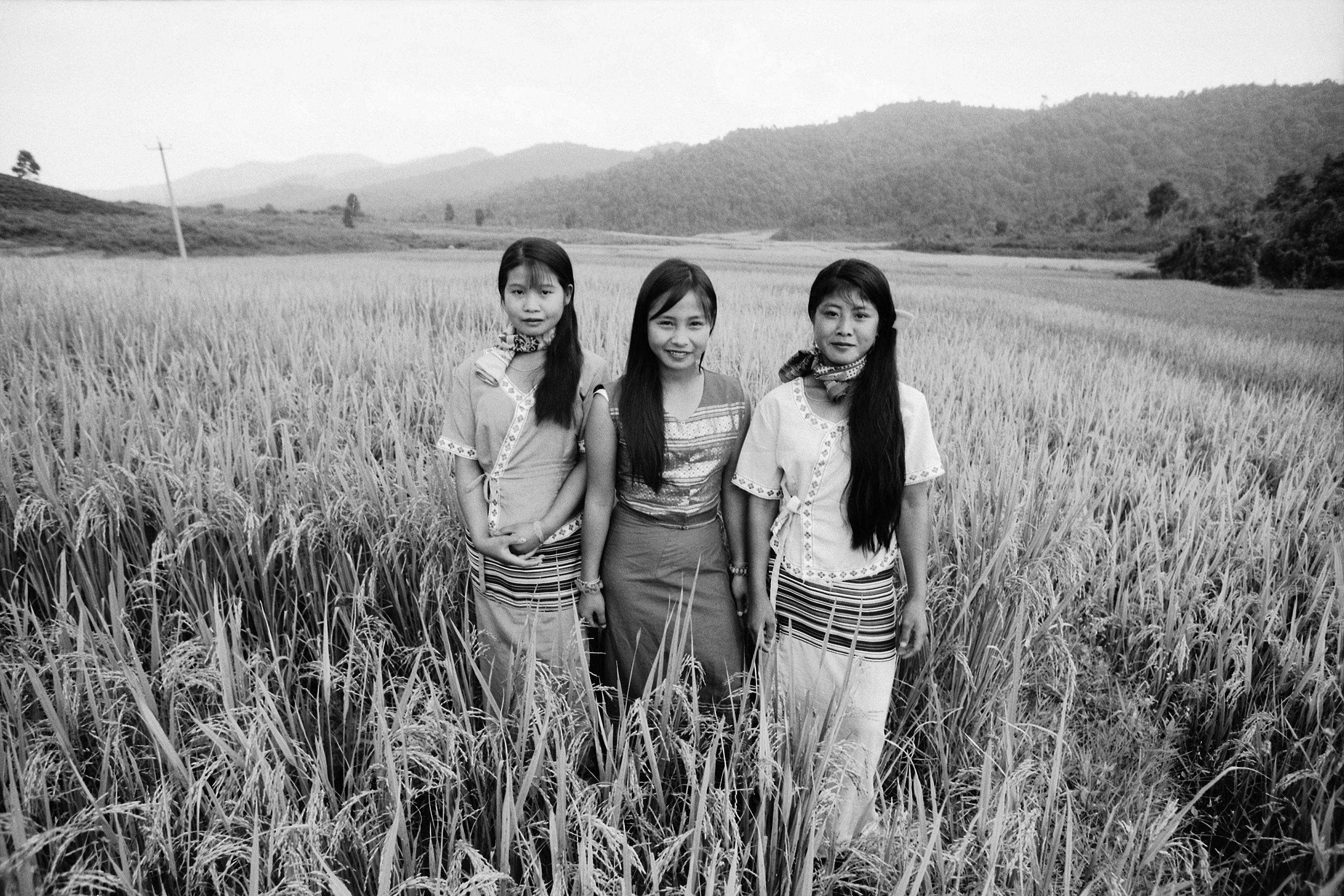 2001年10月,穿着筒裙在稻田里照相的三个布朗族姑娘。