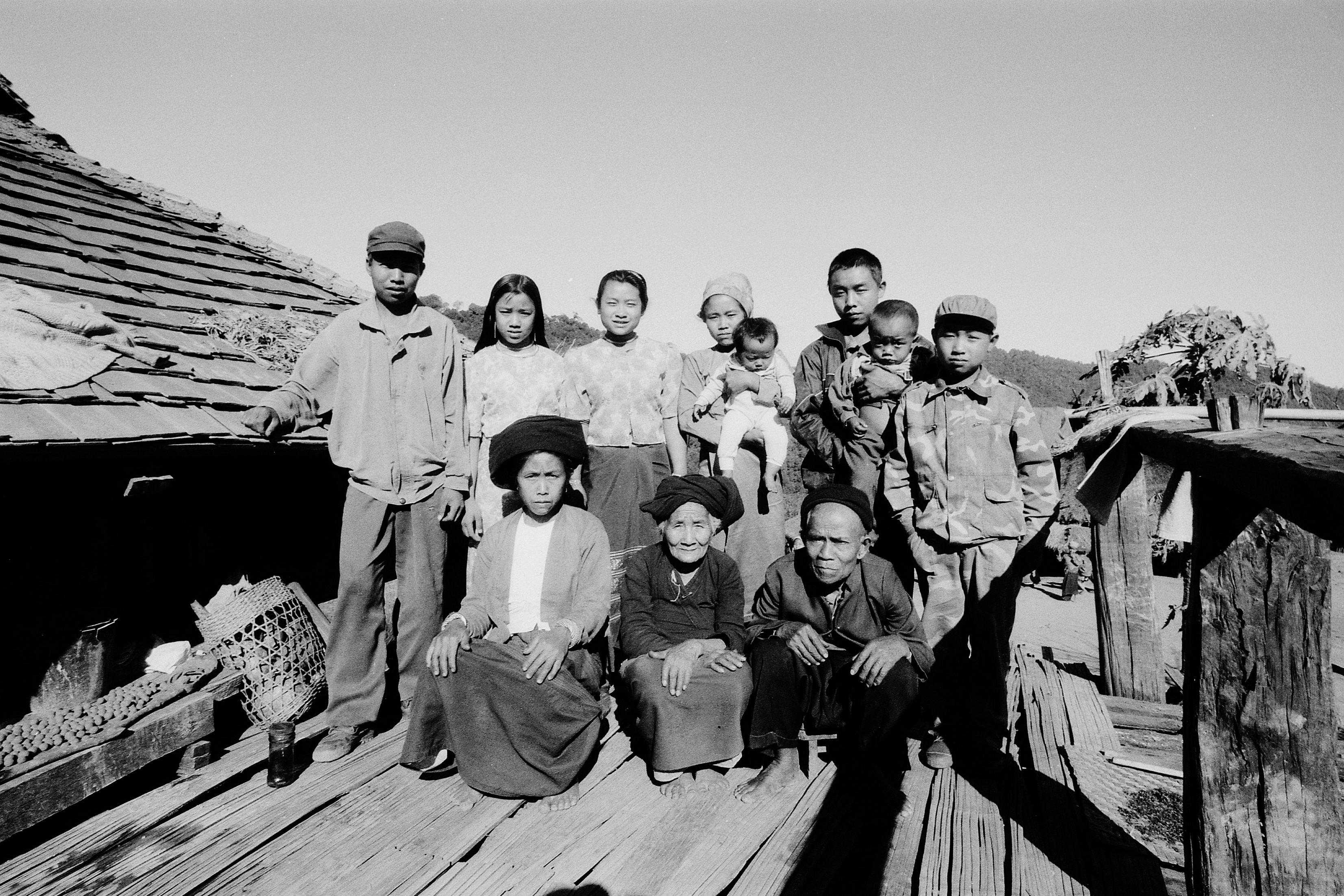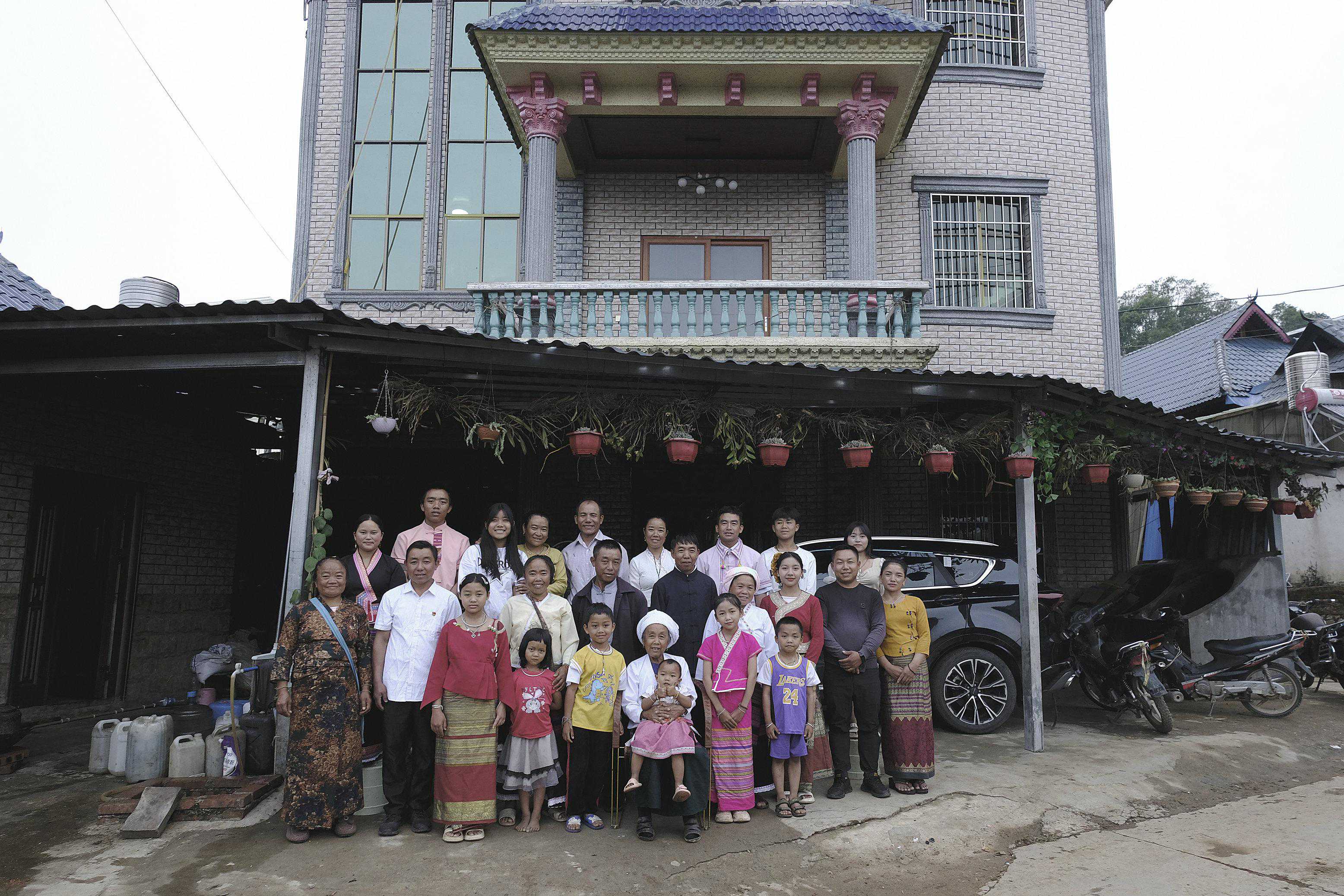 2000年12月,二十三年前,已故老支书岩胆恩的父亲、母亲,妻子玉叫当与儿孙四世同堂,在自家竹楼晾台上拍摄的合影照片。