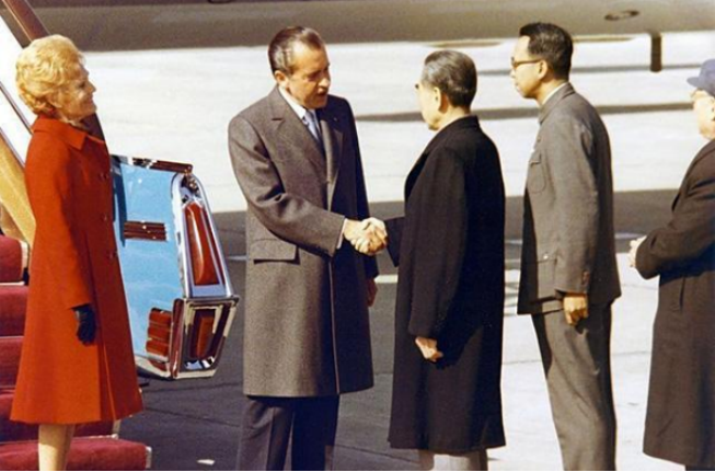 在机场,尼克松与周恩来总理的世纪性握手,宣告了中美两国长期隔绝与敌对态势的结束。