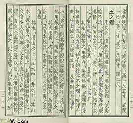 鍑(音辅,或作釜,或作鬴):以生铁为之。今人有业冶者,所谓急铁,其铁以耕刀之趄炼而铸之。内抹土而外抹沙。土滑于内,易其摩涤;沙涩于外,吸其炎焰。方其耳,以令正也。广其缘,以务远也。长其脐,以守中也。脐长,则沸中;沸中,末易扬,则其味淳也。洪州以瓷为之,莱州以石为之。瓷与石皆雅器也,性非坚实,难可持久。用银为之,至洁,但涉于侈丽。稚则雅矣,洁亦洁矣,若用之恒,而卒归于铁也。