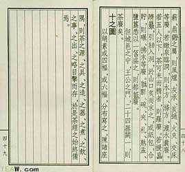 十之图以绢素或四幅或六幅,分布写之,陈诸座隅,则茶之源、之具、之造、之器、之煮、之饮、之事、之出、之略,目击而存,于是《茶经》之始终备焉。