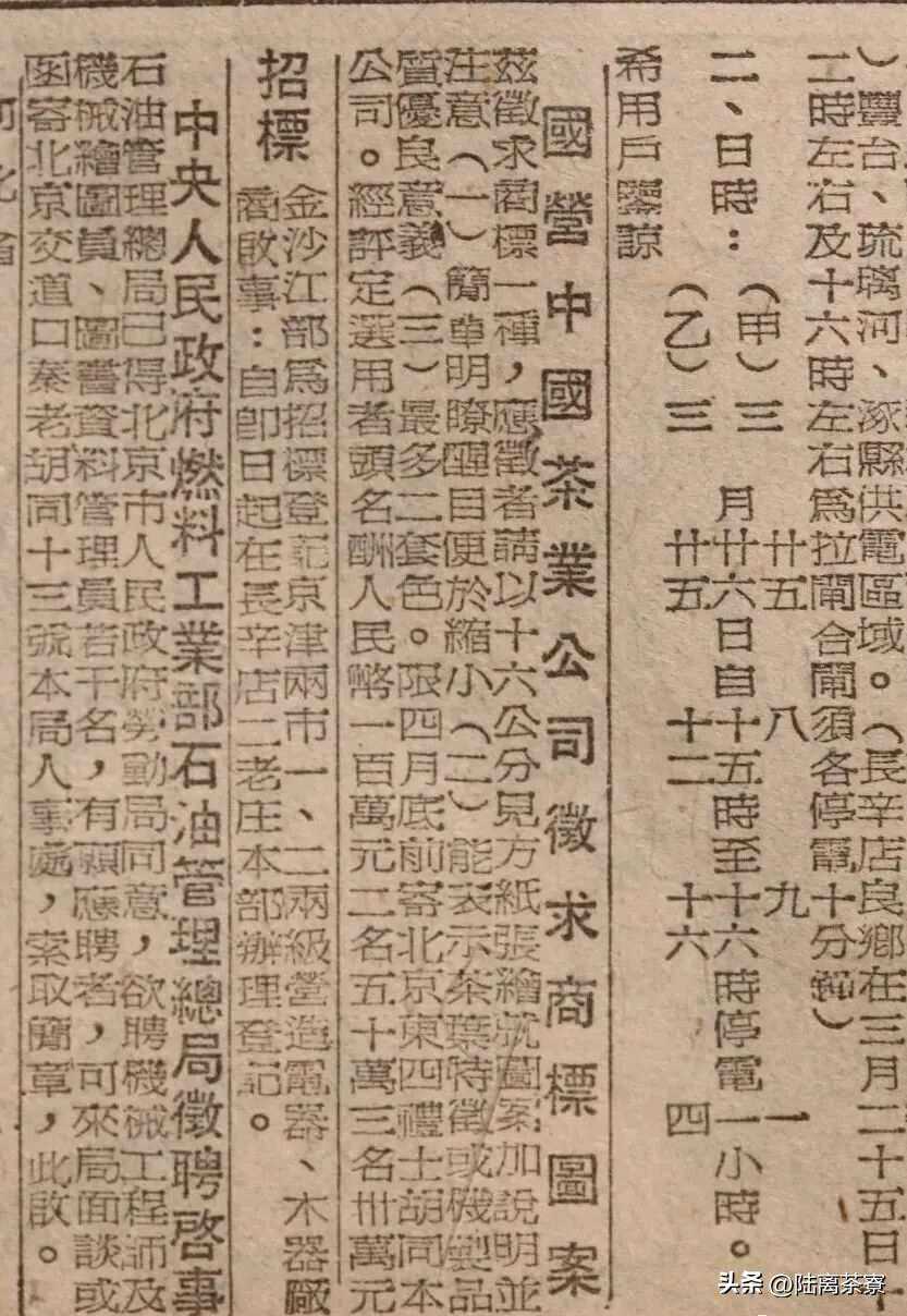 考虑到这些分公司原来都属于旧国民政府,成立初期返聘来很多茶叶人才也与旧中国茶叶公司有关,吴觉农先生提出,中国茶叶必须要有自己的品牌,于是中茶司取缔了旧中茶的盾牌商标,并于1951年3月25日,在第4版《》上发表启事:“兹征求商标一种最多二套色限四月低前寄北京东四礼士胡同本公司“,就新的替代商标公开征求意见。