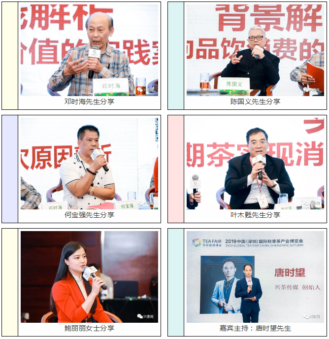在圆桌论坛环节,“中国普洱茶学会”创会会长、著名学者、“中国普洱茶第一人”邓时海先生,普洱茶干仓储存创始人、香港资深茶人陈国义先生,今大福生态茶业有限公司董事长、班章大白菜创始人何宝强先生,中国茶文化推广大使、第二届进博会豫园茶叙会主策划/主理茶人、茗约茶仙子品牌创始人鲍丽丽女士,深圳市华巨臣实业集团副总裁、深圳市好茶仓投资发展有限公司总经理叶木甦先生作为对话嘉宾,兴茶传媒创始人唐时望先生作为嘉宾主持,就中期茶走向品饮消费的深层次原因进行了深度探讨。