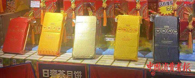 底层是财源广进包装箱,标价168元。底层同时摆放着5款长条状物品,如果不是包装袋上印着“中秋月饼”的字样,记者还真看不出里面装的是月饼。